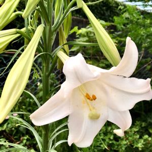 こんにちは😃💐💐 今日の2枚目はシンテッポウユリ(新鉄砲百合)です🥰♡♡♡♡♡ ◎ シンテッポウユリ 白い筒状花を咲かせるユリ目ユリ科ユリ属の耐寒性多年草です。 タカサゴユリ(高砂百合) と、 テッポウユリ(鉄砲百合)の自然交雑で、外見上、親の特徴を受け継いでいます。 シンテッポウユリの両親であるタカサゴユリとテッポウユリはお互いに良く似ています。 テッポウユリは、春、タカサゴユリは、夏~秋にかけて咲きます。 原産地は、テッポウユリが南西諸島で、タカサゴユリは台湾です。 ずっと高砂百合と思っていましたよ。 (((o(*゚▽゚*)o)))♡ 🏷️ 白い貴婦人✨ とっても綺麗に咲いてくれました😊