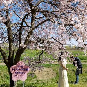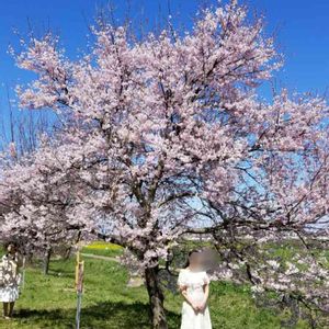 タカトオコヒガンザクラと、 モデルさん。 青い空と、 ピンクの、桜🌸 モデルさんの、白 菜の花の、黄色