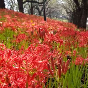 今、幸手の、権現堂に、 彼岸花を、見にきました。 木漏れ日の、 光を、浴びて 彼岸花が、 輝いています。