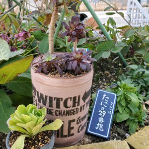 とっとり花回廊の多肉寄せ植えWS行って来ました😄 鉢持ち込みのWSだったので自作のリメ鉢にモリモリ詰め込みましたよ✨ このWSを教えて頂いたGSの花友さんにも初対面👀✨顔知らないのにね、GSでの投稿からこの方かな🤔と声をかけたら当たり🎯逢えてお話出来て嬉しかったです😆⤴️💓 ②🏷️毎月13日と14日は葉挿しの日🌿 なかなか大きくならなかったサブセシリスがこの夏めっちゃ大きくなりました🎵 確か…3年くらいかかってこのサイズなんだけど💦 ③KOWサン♪月の雫サン♪のハロウィンセットGET出来ました❤️ 鉢もピックも多肉ちゃんもみんなめっちゃ可愛い~🤩 ④購入記録🌿 ハニーミントさんの苗ポチリました🎶 6苗と土と肥料のセット 立田錦と斑入りリトルゼム 多肉狩りの予定もあるのに…我慢出来なくてポチリ💦 ⑤パンクチュラータのお花が咲いてました✨でも葉の色と同化してて…なかなか気が付かなかった…🤣