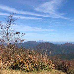 2019.11月 毛無山山頂 今日は本当にいいお天気で、奥に鳥取の大山がくっきりどっしり綺麗に見えていました。 登ってきた牛曳山、伊良谷山の山肌の紅葉も青空に映えて綺麗でした。絶好の紅葉登山日和だったな。 キク科シリーズ報告はまた明日に。