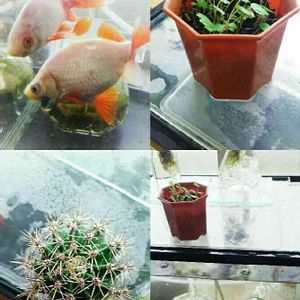 水槽上の ワイルドストロベリーと 実家から抜き取ったサボテン。 サボテン水耕栽培1年たちました。
