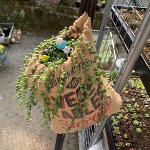 伸びて来たグリーンネックレスをカットして、吊り鉢の代わりに、麻袋に植えてみました。 麻袋は通気性が抜群に良くて、濡れた状態の方が強い。と昔学んだ記憶があり、鉢代わりに使用。 花と野菜の培養土も、たっぷり入れた用土にしました。 グリネは、お花の様に育成して、余り日光も必要としないみたいなんで、直射を避けて吊るす場所を考えなくっちゃ❣️ (*^o^*)