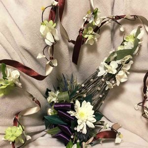 2019.10.22 押し花教室にて花束💐風に作成。 レースペーパーを包装紙に見立てて。 使用した押し花は キバナコスモス トレニア アジサイ オリヅルランの葉 シダ類などです。
