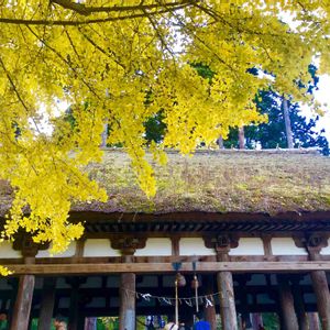 長床の銀杏の大木は800年以上前のものとのこと。 この葉が散ってしまっても美しいのです。