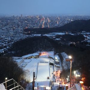 札幌 大倉山展望台 リフトに乗って☆ こんな所から滑って行くなんて考えられません。 でも、雪と木と灯りと、遠くに時計台が見えてステキな景色でした(*ˊᵕˋ*)