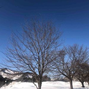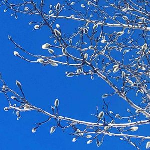 豪雪地帯の晴天に春の芽吹きの モクレンの蕾