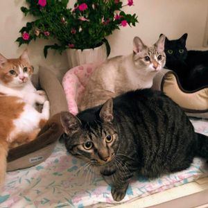 2025.8.22 みちのすけさんの ニャンニャン祭りに参加させて頂きます😽😸🐈🐈⬛💖 1️⃣愛猫全員集合と💙🤍🌿 🌈カルピン♀😽も空〜参加😅 2️⃣チャッピーは最近鼻が汚れている😅 3️⃣ノワールはデブ街道まっしぐら😅 4️⃣グリは最近粗相しなくなった😅 5️⃣3匹と🩷ナツズイセン💜ミソハギ❤️ホウズキ