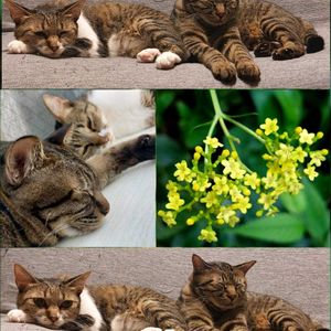 2025.9.22 ニャンニャン祭りに 2枚目投稿させて頂きます😂🙏💦🙇 ①今朝のベランダの花と コラージュ 段菊が咲き始めました🍀 火祭りの花 小菊 今朝の愛猫ちゃん達 寝起きの様子 ⬇️グり😺は珍しくケージにいました😅 ➡️チャッピー🐈️17才はいつもの ソファーに ⬅️ノ ワール🐈⬛もいつもの場所😅 ②🐈⬛ノワールm(_ _;)mごめん寝ポーズに🤭 食いしん坊グリ🐱はバター🧈を舐めて チャッピー🐈️は徘徊&時々睡眠💤 みんな愛おしいです(*˘︶˘*).。*♡🍀
