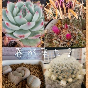 春来た? 赤花銀手毬🌹 カルメナエ💮 振武玉🔮 いつのまにやら お花咲いてる〜🥰🌵 桃太郎(仮)絶好調😍 女雛は花芽がにょろん🌱 チョコジサマ うちの紅稚児🔴 めっちゃ増えて垂れてます🤯💨 ふぅサマ 何かぽっこり出ました🤣💨💨💨