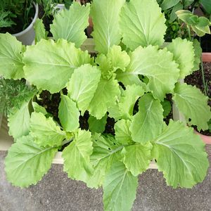 *花心白菜* プランターから飛び出すほど大きくなってきました。 嬉しい💕と思っていたら、1株は葉っぱと中央の新芽の部分を食べられています。姿が見えないからヨトウムシかなぁ💦 結球しない白菜だから外菜から食べていこうかと思案中です🤔