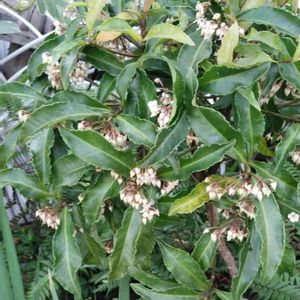 母屋の玄関前の柘植の木の下で、万両が咲いていました。 地面の一画がこぼれた花で白くなっていました。 多分小鳥さんが運んて、ここに種を蒔いてくれたのだと思います。 赤い実がなって暫くすると、全部食べられちゃうんですけど。 美味しいのかな?