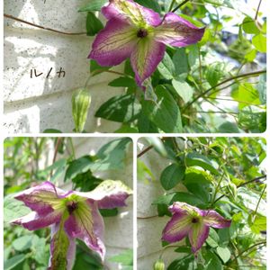 我が家のクレマチス開花中 紫のグラデナイトバード ピンク白のプリンセスケイト 白のふわふわ系マリアコルネ リア 八重咲き九重 壁際フェンスに咲かせてます