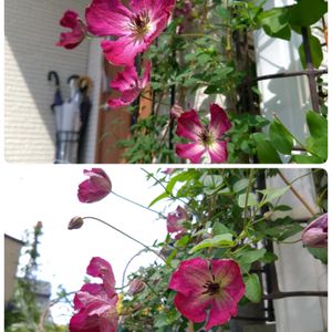 19.5℃🌅/30.2℃☀ いきなり真夏がやってきました💦 玄関前のクレマチスは、下半分くらいが見頃を迎えようとしています💕 1️⃣2️⃣ルノカ だんだん調子よくなってきました🙌 3️⃣ネイティブダンサー 伸びがおだやかなので次はまっすぐ上に連れていきます💃 4️⃣ナイトバード メタリック感✨すごくカッコいい!