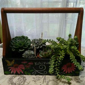 ジャジャ〰ン❤️ お待たせしました〜♪ ねこぐるみさん作のチョークアートBoxです〜🌸 うちの子を可愛く描いていただきました😽 すっごく可愛いですね〜(≧∀≦)💕 もう♪気に入り過ぎて大変です🌼 私のお気に入りは何と言っても〰🎵 一番右のお手手パーして上目づかい😆♪ もぅ可愛すぎだしそっくりだし💓 それから、虹の玉をちょんちょんってしてるとこと♪ それからそれから一番左のお顔出してこっち見てるとこと♪ 鮮やかに描かれたエケベリアさん💗 大好きな乙女心さんに虹の玉❤️ 周りにはハートカズラさんが描かれてるんですよ〜💖 もう全部お気に入りなんです(*˘︶˘*).。.:*♡ そしてなんと❣️ うちの子そっくりピックまで〰😻 そっくり過ぎて感動しました💓 このBoxは持ち手付きなので いっぱい多肉ちゃんを入れて持ち運べます♪ ねこぐるみさん、 本当に最高に素敵な作品をありがとうございました😊 大切に大切に使わせていただきます❤️