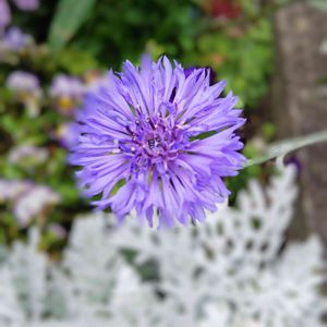 💜💙矢車草💙💜 生協の種からやっと咲きました❤️ 柵を飛び出してお隣の通路までくねくねしてます❗️そんなものですか? 毎日矯正するのにまたくねくね😆 でも色はベスト💜💟💙