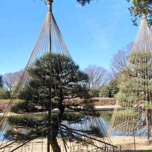 おはようございます😊🌄 🌼今日のお花マツ 池の側の雪吊りされたクロマツが青空に映えて素敵です💚🌿