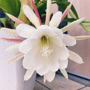 苗を頂いてから3年目にしてようやく初めて咲いたクジャクサボテン!蕾の間「何色かな?何色かな?(*´꒳`*)。oO(黄色だといいなー)」と期待していたら「白だったー!!( ˘ω˘ )」 清楚でキレイな白(*^^*)咲いてくれてありがとう!( ´ ▽ ` )