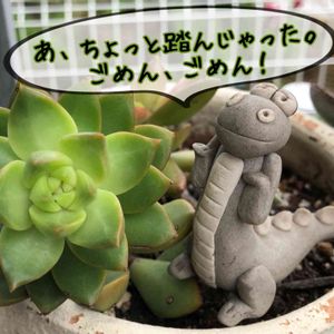 先日、ドライブに行き おしゃれな道の駅では無く 地元密着な感じの 産直屋さんに寄りました たくさんでは無かったけれど 多肉ちゃんがありました 何とゆう種類かな?と 付いている札を見たら 「○○ ○子」と、生産者さんの お名前が、😅あはは とゆう訳で、品種は わかりませんが可愛いいので ふたつ買ってきました〜😄 で、寄せ植えしました。 あら、ザウルス君久しぶり〜