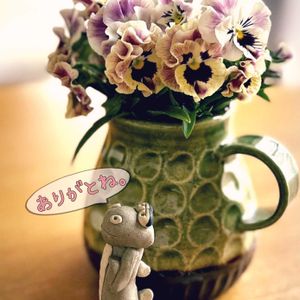 なが〜く楽しませてくれた ビオラさん達 いよいよ終わりが来ました 最後は摘んで お気に入りの花器に。 優しいザウルス君も 見に来たよ☺️