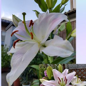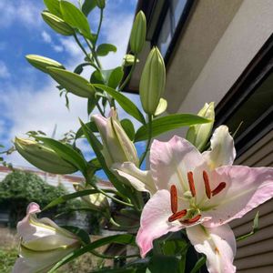 💕マレロ💕 販売名ピンクカサブランカ 2018年に球根を植えて4回目の開花です。 植えっぱなしなので毎年細くなってきてますがよく咲いてくれます😅 昨年まではピンク💗で咲いてましたが今年は白っぽい🤍💗 これはこれでいいな🎶