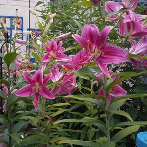 オリエンタルリリー💖 初めて育てました🎶 153センチあります😳 こんなに高くなってビックリ‼️ お隣はマンデビラ「ピンキーフラッシュ」💕💕 去年の母の日にもらって冬越ししました🥰 頑張ってくれてありがとうね❤️