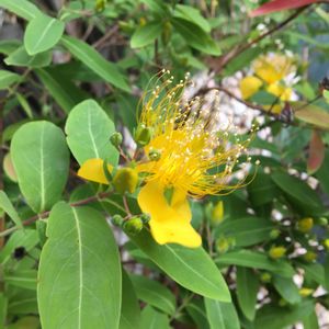 一瞬「ビヨウヤナギ」かな?とは思いましたが、 「ビヨウヤナギ」はもう少し花びらが細い印象でした。 やはり「ヒペリカム」でしょうかね⁉️