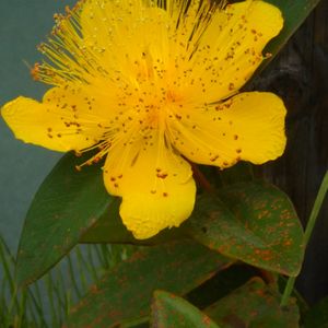 西洋金糸梅(セイヨウキンシバイ)/ヒペリカム・カリキナム オトギリソウ科オトギリソウ属の半常緑低木。地下茎を出して殖え、各節から茎が立ち上がる。樹高50㎝前後に成長し、グランドカバーとして利用されることが多い。葉は楕円形~卵形でほぼ対生する。花期は6~7月。花は径約5~10㎝、黄色い5弁花で上向きに咲く。多数の雄しべは1束100個ほど、基部で5つの束になっていて花弁より長くて真っ直ぐ伸び、葯の色は赤橙色。果実は蒴果。 よく似た美容柳(ビヨウヤナギ)の葉は十字対生、雄しべはカールして伸び、葯は黄色~白色。