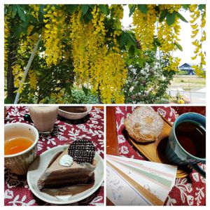 花トモ宅のキングサリ。 ツルではないけど枝がしなやかすぎて心許なく……アーチ状に仕立ててあります。 すでにオバサン、オジサン年齢の子供たちから貰った母の日プレゼント🎁 息子はいつもケーキ、娘からはカフェトレーと大量のブックマーク🔖 ワタシは尋常じゃなく本を読みます😅