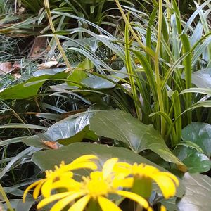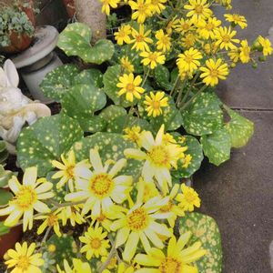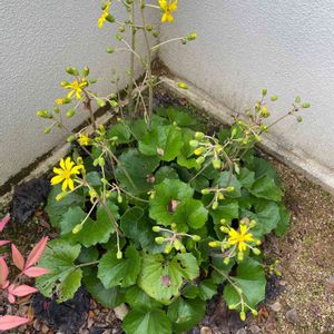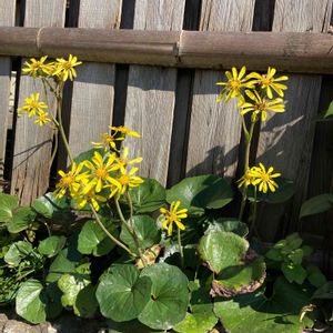 ツワブキ 夕陽がとっても綺麗でした🌇 夕陽の少し右に富士山がうっすら...🗻 見えたでしょうか?😅 お友達から斑入りのツワブキを いただいた翌年... 普通のツワブキもいただきました。 肉厚な葉っぱ そして暑さ寒さに強く 日陰でも青々としている そんな手間いらずの素朴な感じが お気に入り😽💕 初めて花をつけてくれました☺️ 黄色い花が、 "見て👀見て👀" と言ってるようようです🌼