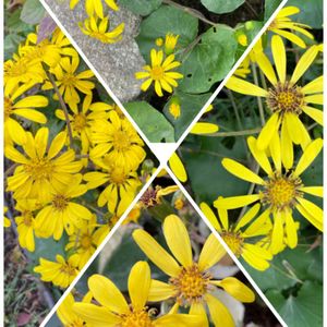 ツワブキの花 我が家のお庭のツワブキの花❗️ 色んな形の花びらが有ります。 細い花びら、丸いはなびら 花びらがビッシリと、重なった物など⁉️ 葉っぱも、大きい物、小さなもの、 白い、ふ、が入った物‼️ どの花見ても、きれいだなぁー‼️