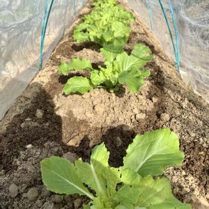こんにちは😊 こちらの畑の花芯白菜も葉が立ち上がって来ました✨ 3~4枚目は9月の始め頃まいたオレンジクインです🌱 歯の立ち上がり方や玉の違い(花芯白菜は玉といわないかもですが)がとても楽しいです😆✨ いつまでも暖かいのでネットがなかなか外せないので写りも悪くすみません💦
