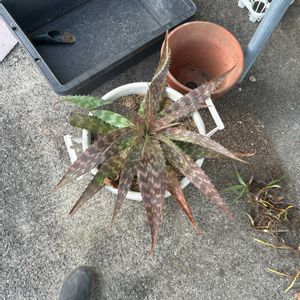 夏に地植えしてあるものを株分けしてもらったアロエなのですが、木立アロエかとおもっていたら、横に低く広がるので、ちがうようです。 買ったときは室内用で斑入りだったそうです。 なんという種類のアロエかご存知のかたいませんか。