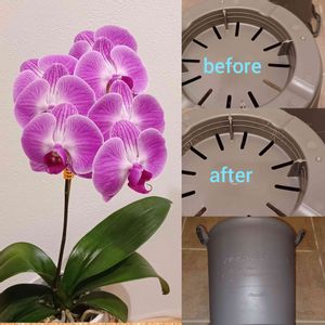 ミディ胡蝶蘭、咲いてますよぉ🎵 3週間になりますがまだまだ美しい💕 お水は1週間に1度。 乾いて軽くなったのを確認してからです。 さて、そろそろ植え替えシーズンを迎えるワケですが… 取っ手が付いてて縁が無いところが気に入って買ったものの、水が溜まる構造が気になって使わずにいた鉢を、どう加工するか思い付いたので更に購入し頑張って加工しました! ノコギリでスリットを切るという私でも出来る加工です。 水が溜まる構造を残しつつ溜まる水量減らし、細いスリットにすることでじんわり水が抜けるので一旦は加工前と同じく水が溜まるバス✨️ 3サイズ、4鉢加工しました! そして加工していて気がついた! 両面に文字が書いてある💧 文字が無い方を正面にしようと思ってたのに😅 こういう模様って片側しか無いのが普通だと思い込んでいました😑 取っ手の裏の溝も無いともっとイイのになぁ~。 直径25cm30cm35cmの3サイズ グリーンとグレーの2色 アイカ パニエポット