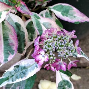 アジサイ カラフルランジア 葉っぱはきれいな白い斑入りです。 お花も面白い色💓💓 まだ小さいので、来年以降に期待です✨✨ 今日は一日台風の影響を受ける予報でしたが、さほどでもなくてほっとしています。 雨も怖いけど風も怖い😂😂 最近は風で植物がダメになることが多いんです💦💦