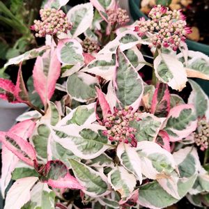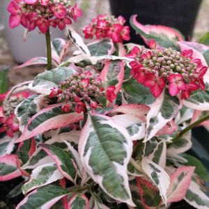 『カラフルランジア・オーロラ』 ガーデンアジサイ アジアンビューティーから生まれたカラーリーフアジサイ。春から落葉するまでカラーリーフとして楽しめます。 インスタで拝見してから魅せられてしまいました𓂃 𓈒𓏸 ♡ たまたま出向いた園芸店に少しだけ入荷してるのを見つけて…🛒ポイッ病です🤣𐤔 🏷のようなお花が💓〜 リーフ🌿が〜 もう既に葉先がピンクですよね💓 想像するだけでニャニャしちゃいます🤭💓 ※遅い時期の剪定とか深く切ることは避けましょうとあります!