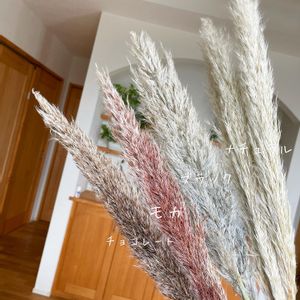 庭のパンパスを収穫し、染めました🌾 並ぶとかわゆい🧡 ブラックは色が入りにくくてこれが限界でした 染めずにナチュラルももちろん大好き。 買うと結構いいお値段するけど、自分でやればとっても経済的👏