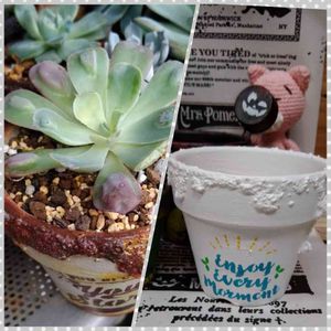 ちょっと…(-。-)y-゜゜゜☕ めちゃつかれた… 腰と膝が限界や😅😅 改装なんて嫌いだー😭😭 っとちょっと愚痴りたい気分😥 左は台風の雨の中 コメリさんから連れ帰ってきました😅 やっと出会えた💕 右はお汚しなしのリメ鉢…珍しく😳