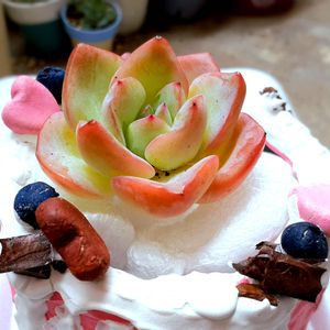こんにちは〜☔/☁ 今日の気温(16・27) ベランダ🌡 18℃ 24℃ 今日は冷たい☔ 寒いぞ〜 苺のシュークリームちゃん🍓 美味しそうな名前と可愛い多肉ちゃんᥫᩣ ̖́- 実物はもうちょっとピンクよん😊