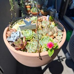 terra cotta大鉢に、真夏最後の寄せ植えを作りました❤️ これで、植え付け待機中の苗が無くなり、安心しました☺️ バルコニーの多肉達は遮光無しで頑張ってます❗
