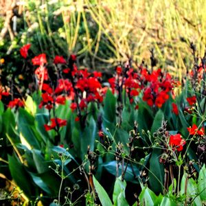 赤いカンナの花 通り道のお宅の畑に 朝の散歩道