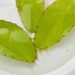マザーリーフ (セイロンベンケイソウ) 久し振りに芽出ししました😊 10年程前ハワイの空港✈️で、余ったドルで購入した植物 袋に葉が2枚入ってました 同時にプルメリアの枝も購入しました マザーリーフはハワイ由来ではないと分かり、テンションが下がり少し放ったらかし状態でした 冬も外でしたが耐えて育ってました 今回強風で葉が飛んでいたので久し振りに芽出ししてみましたよ (風で葉を飛ばすのは繁殖方法だと思われます🤔) 鉢皿に水を張り浮かべる(沈んでもok)だけ、10日位で葉のギザギザ部分から芽が出て来ます😊 冬に花が咲くようですが大株にしなくてはいけないので、まだ見ていません😅