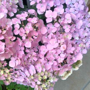 今年お迎えしたラグランジアクリスタルヴェール2。 園芸店さんが秋からベビー苗を6号鉢に植え替えて育ててくださったものだそうで、ネットショップにて購入しました。 ただ、ラベルの写真がブルー系だったからてっきりそうなるとばかり思っていて…!届いて箱を開けた瞬間、ピンクが目に入った時には一瞬絶望してしまいました…(ごめんね、お花はみんなきれいなのにね) 向こう側半分は最初から開花済みだったお花、こちら側はお家に来てから開花し始めたお花です。 ミョウバンを与えたからか、すこーしずつ紫になっているような? そして向こう側はなんだか額に緑色が混じってきているような… これはもう枯れてきているサインなのかな? 四季咲きだし、古いお花は早めに切り取った方が次のお花が上がってきやすいのかなー?と悩んだりしています🤔