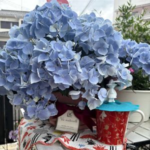 紫陽花が欲しくてホームセンターへ🚗³₃ どの品種にしようかむっちゃ悩みましたが、ラグランジアお迎えしました(о´∀`о) 早速、スリット鉢に植え替え、室内の陽のあたる場所へ飾りました(*´艸`)フフフッ♡