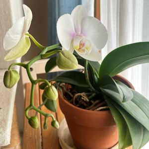 この冬にgreensnapからモニターに参加した大阪府花き振興協議会のミディ胡蝶蘭・ファーストラブ、 元気にしています。 素焼き鉢に水苔植えにして屋外管理したら 新しい花芽ができて、いい感じに咲いています。 今は4輪、 先端に蕾が見えてるからもっと咲くかも! ワクワクしています。
