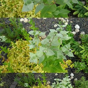 この変わった植物はなんという名前でしょうか🌱? 葉っぱ自体が花のようで、実際には真ん中に小さい白い花が咲いています😃❀.*・゚ 下の黄色い葉っぱは別の植物のようですが、レイアウトが綺麗です。(公園にて)