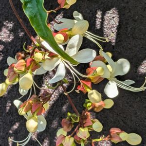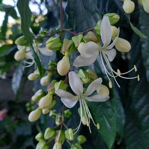 *クラリンドウ* 今朝の庭、クラリンドウの白いお花が咲き出しました。 4️⃣枚目、折れた枝を水にさしていたのが根を出しそうです。