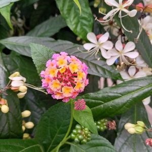 おはようございます👋 今日のお花ランタナ💛💗🧡 まだまだ頑張って咲いているお花が クラリンドウの間から顔を出して コラボしてたので🤳1枚💕 グラデーションがとっても綺麗な ランタナです💕🌟🌟