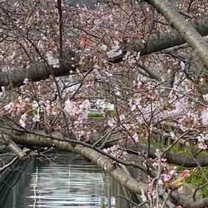 境港の水木しげるロード、大正川の桜🌸 ポチポチ咲きだしましたよ。 春ですね。