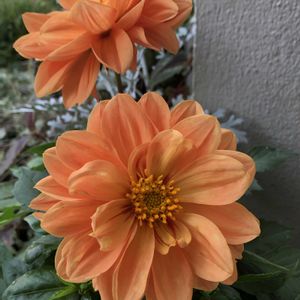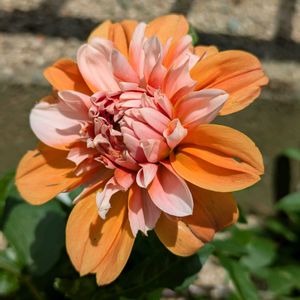 ◯ダリア◯ ラベラグランデ キャラメルです。 数年前に園芸店で一目惚れして購入したダリアです。 オレンジと白の混ざり具合が花によって違うので開いてからのお楽しみです😊一枚目のような素敵なこともあれば、3枚目のように全然混ざってない😅みたいなことも。 今年の猛暑で鉢に植えたものはダメにしてしまって、鉢から地面に根をを張ってしまったものが生き残りました😅それはもう、予想外にモリモリ育って😆 来年はもう、最初から地植えにしようと思います。